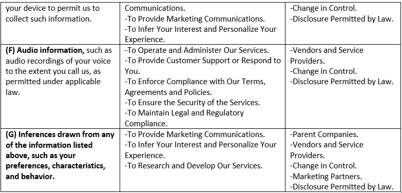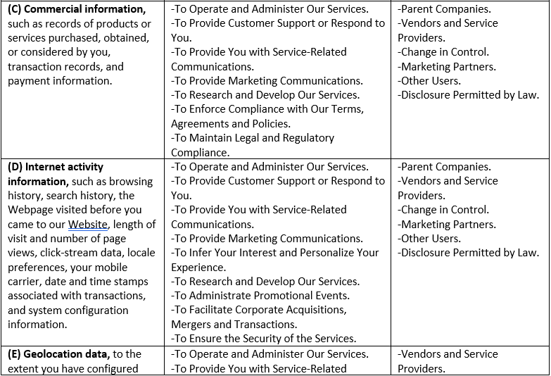 In the preceding 12 months, depending how you interact with our Services, the chart below describes the categories of personal information collected (as defined under Cal. Civ. Code §1798.140(v)(1)), the sources and purpose of such collection, and the parties to whom the information was disclosed for business purpose.